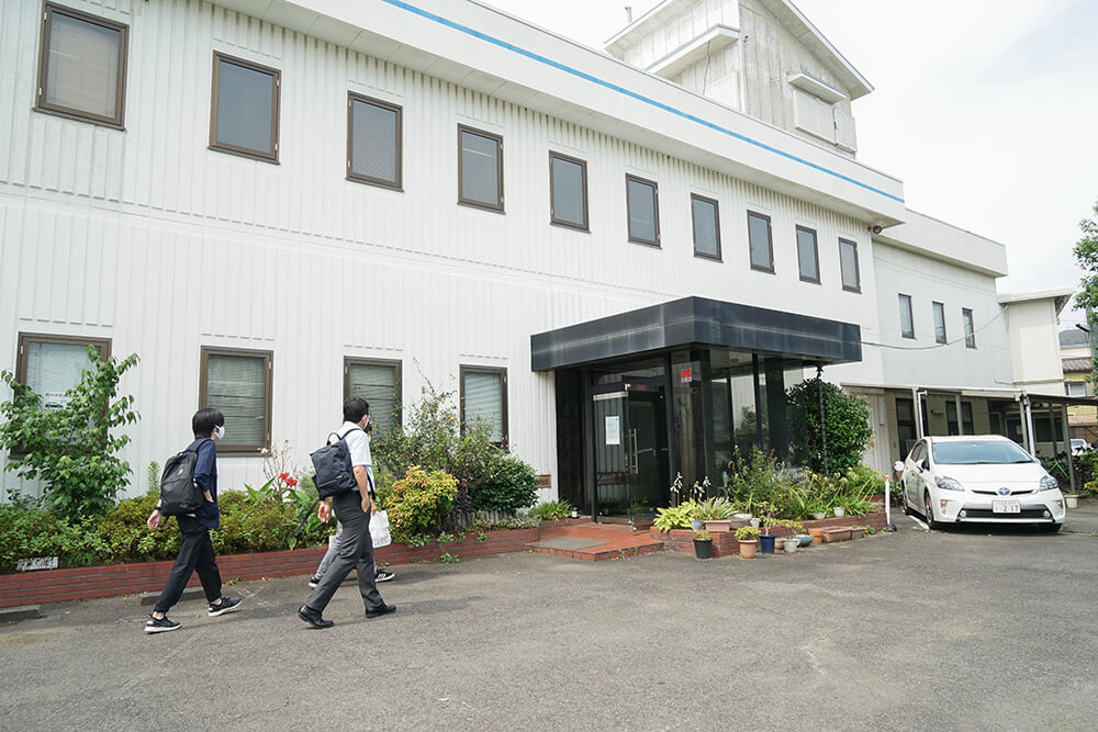 本社正面玄関にて