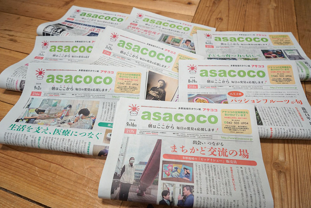 | asacoco | 清瀬市・東久留米市・西東京市・武蔵野市・三鷹市・小金井市・小平市・国分寺市・国立市・東村山市・東大和市・立川市・日野市・八王子市 | 月2回 | アサココ | 35万部 |