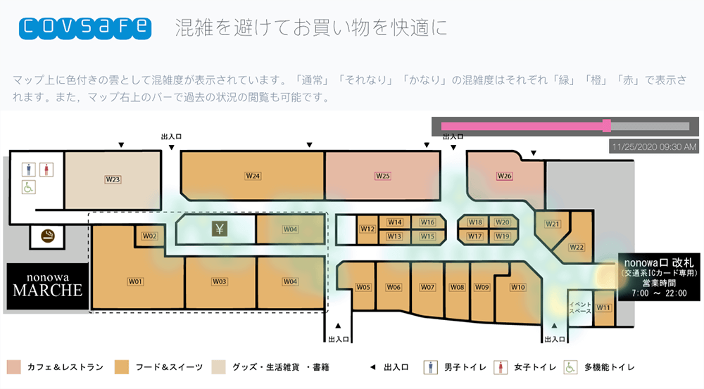 混雑状況を可視化したもの。館内のサイネージにも表示され、来館者が自主的に混雑エリアを避ける行動も見られた。